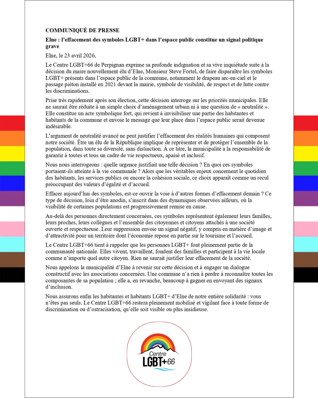 Le Centre LGBT+66 milite pour une sociĂ©tĂ© inclusive, oĂč toute personne doit ĂȘtre respectĂ©e, en particulier quelle que soit son orientation sexuelle ou son identitĂ© de genre.